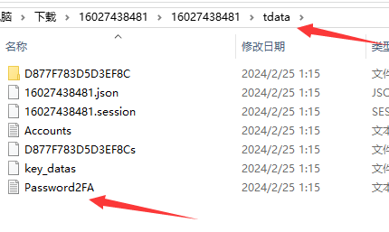 4、打开带有电话号码的解压后的文件夹,然后找到我们需要的文件夹,就是 "tdata"。其中还有一个文本文件,包含2FA授权的密码,如截图所示(这个文件一般在tdata文件夹下面的password2FA文件里)。